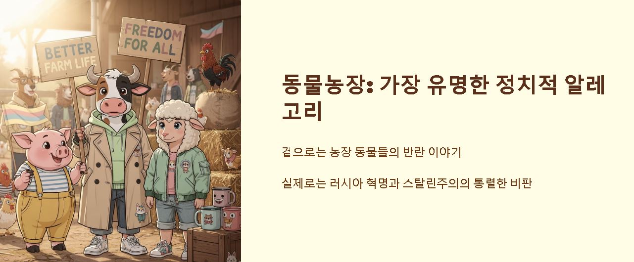 알레고리를 가장 쉽게 이해할 수 있는 예시는 조지 오웰의 소설 '동물농장'입니다. 겉으로는 농장 동물의 반란을 다룬 이야기 같지만, 실제로는 러시아 혁명과 스탈린주의를 통렬하게 비판한 정치적 알레고리인데요. 이처럼 작가는 검열을 피하거나 메시지를 더욱 강렬하게 전달하기 위해 이 기법을 적극적으로 활용해 왔습니다.