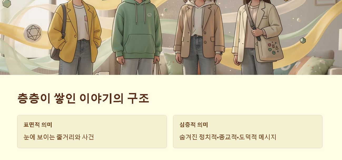- 이중적 의미: 눈에 보이는 '표면적 의미'와 그 뒤에 숨은 '심층적 의미'가 공존합니다.