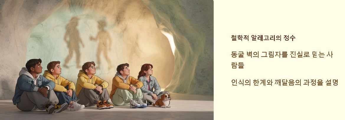 - 플라톤의 동굴의 비유: 동굴 벽의 그림자를 진실로 믿는 사람들을 통해 인식의 한계를 설명하는 철학적 기법입니다.