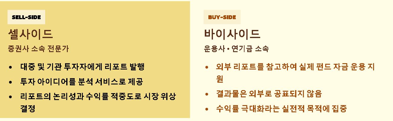 - 증권사 소속 전문가: 대중과 기관 투자자에게 리포트를 발행하여 투자 아이디어를 판매합니다.