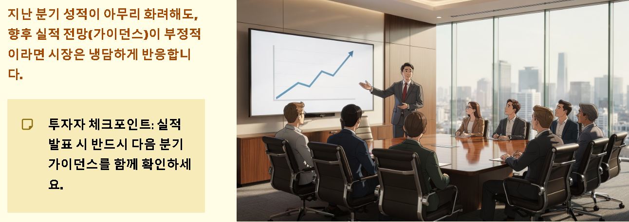 - 가이던스의 중요성: 지난 분기의 성적표가 아무리 화려해도 향후 실적 전망(가이던스)이 부정적이라면 시장은 냉담하게 반응할 수 있습니다.