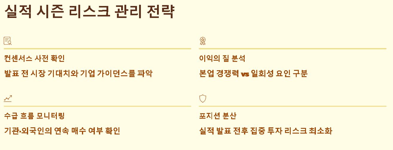 - Q: 실적 발표 직후 추격 매수해도 될까요? 업황이 개선되는 초입 단계라면 유효할 수 있으나 주가가 이미 고점이라면 실적 확인 후 눌림목을 기다리는 것이 현명합니다.