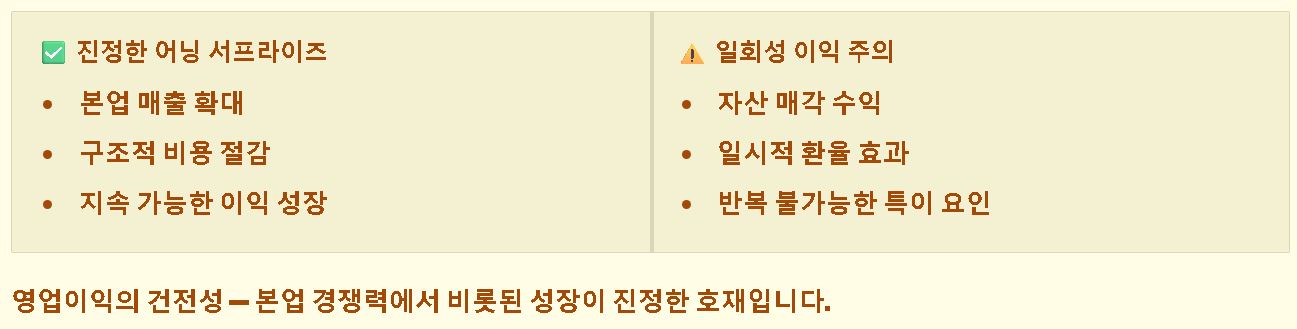 - 영업이익의 건전성: 자산 매각이나 환율 효과 같은 일시적 요인보다는 본래 사업 영역에서의 매출 확대와 비용 절감이 동반된 성장이 진정한 호재로 평가받습니다.