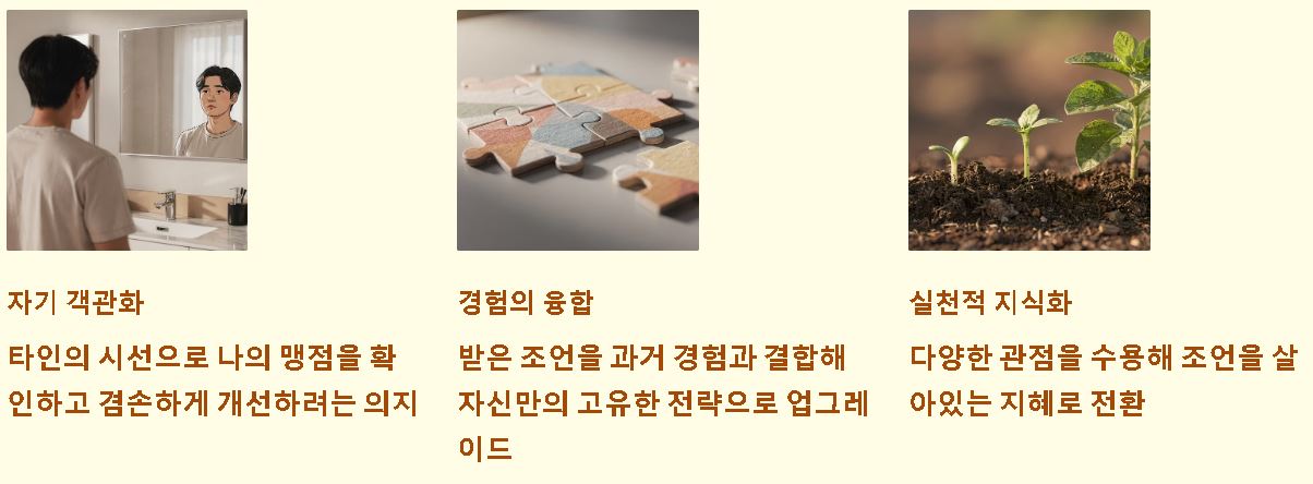 - 비판적 수용: 조언을 맹목적으로 따르기보다 본인의 상황에 맞게 재해석하여 적용하는 유연함이 필요합니다.