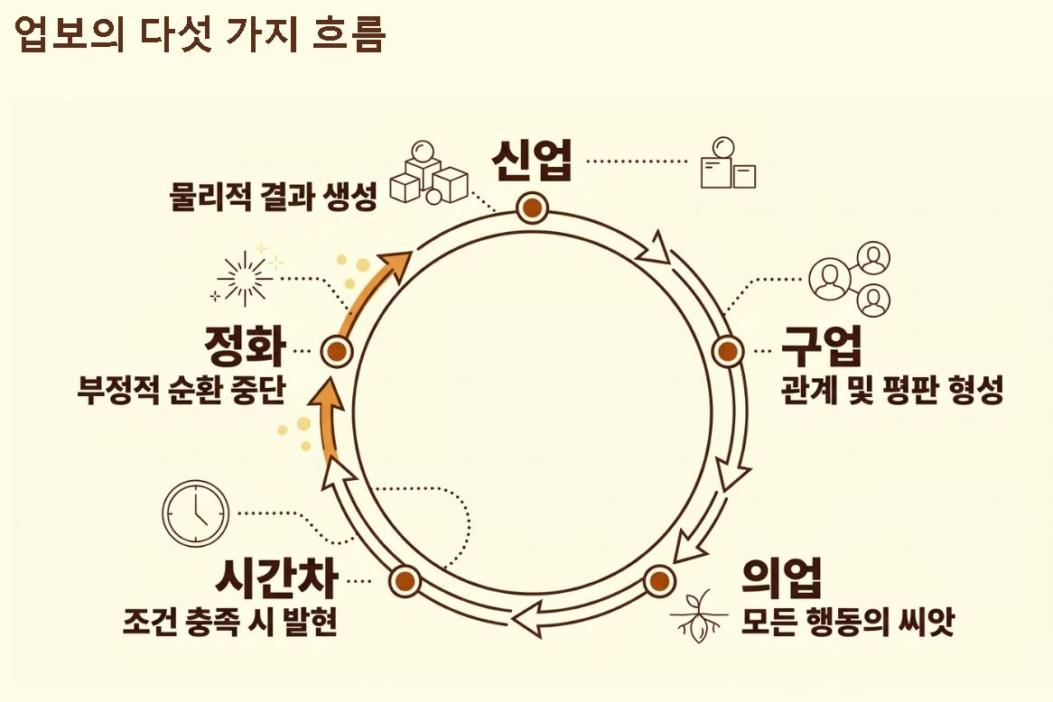 - 행동의 패턴화와 경로 의존성: 한 번 정해진 행동의 방식은 뇌 회로에 깊이 새겨져 비슷한 상황에서 같은 실수를 반복하게 만드는데, 이를 인식하고 의도적으로 바꾸는 것이 업을 정화하는 길입니다.