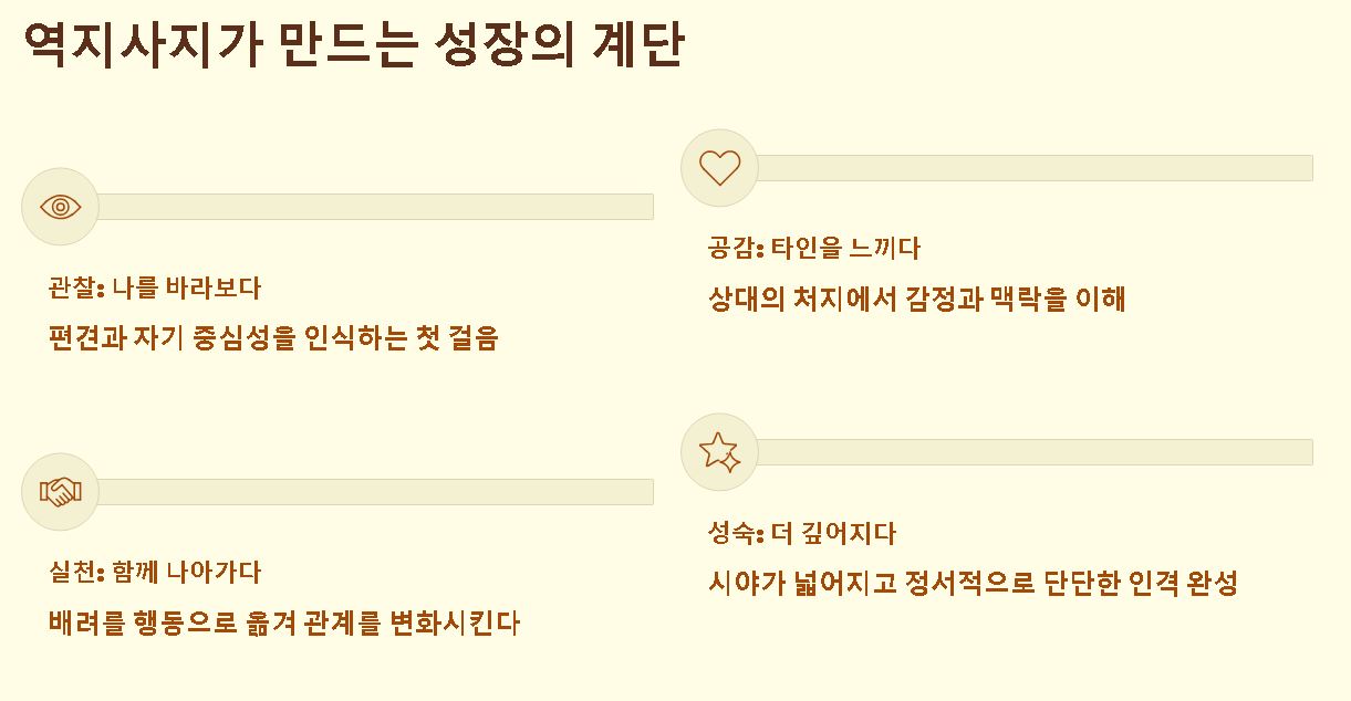 타인을 배려하는 마음은 결국 자기 자신의 내면을 풍요롭게 만드는 일입니다. 역지사지 뜻을 실천하다 보면 세상을 보는 시야가 넓어지고, 편협한 사고에서 벗어나 정서적으로 훨씬 단단한 사람으로 성장하게 됩니다.