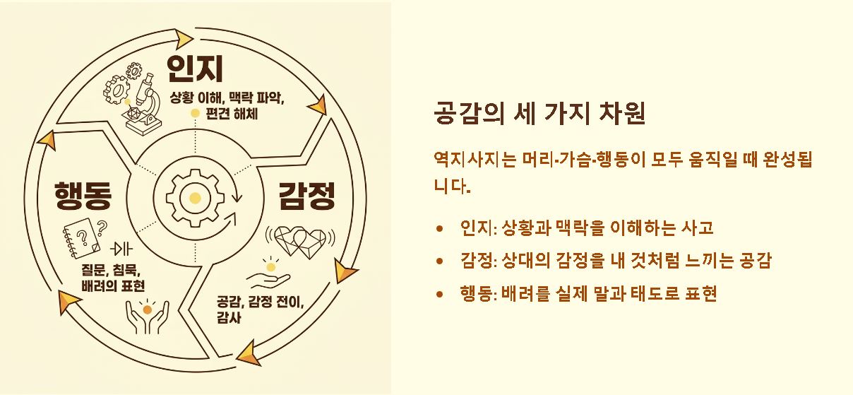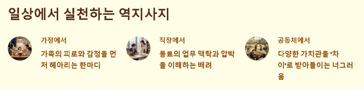 - Q: 역지사지를 더 잘 실천하는 팁은? 대화 중 "내가 당신이라면~"이라는 문구로 생각을 시작해 보세요. 뇌의 공감 회로가 활성화되어 훨씬 부드러운 화법이 가능해집니다.