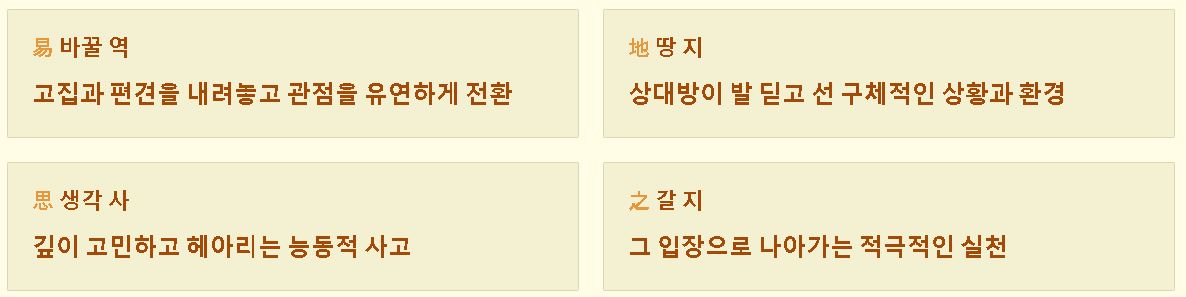 - 바꿀 역(易): 자신의 고집이나 편견을 내려놓고 관점을 유연하게 전환함을 의미합니다.