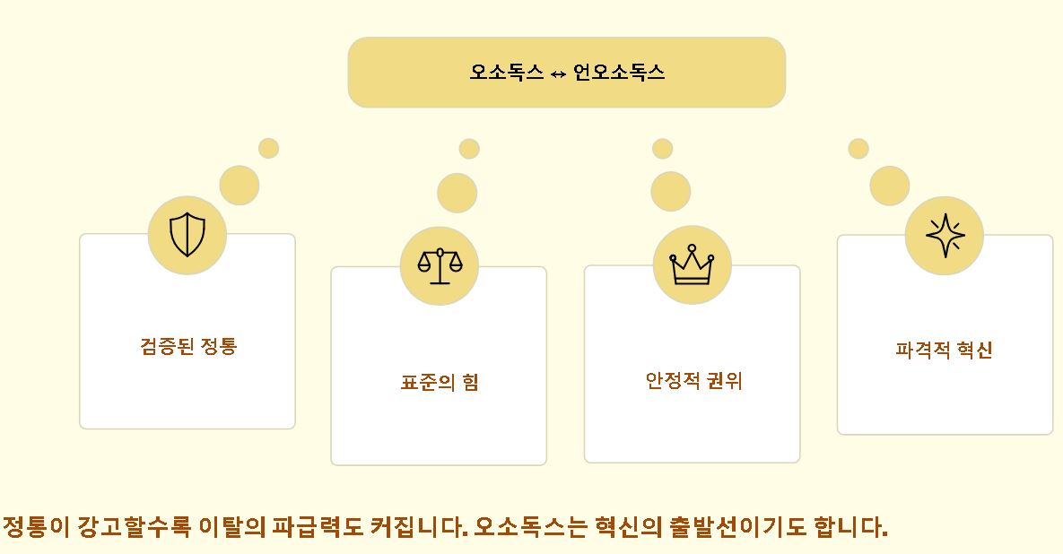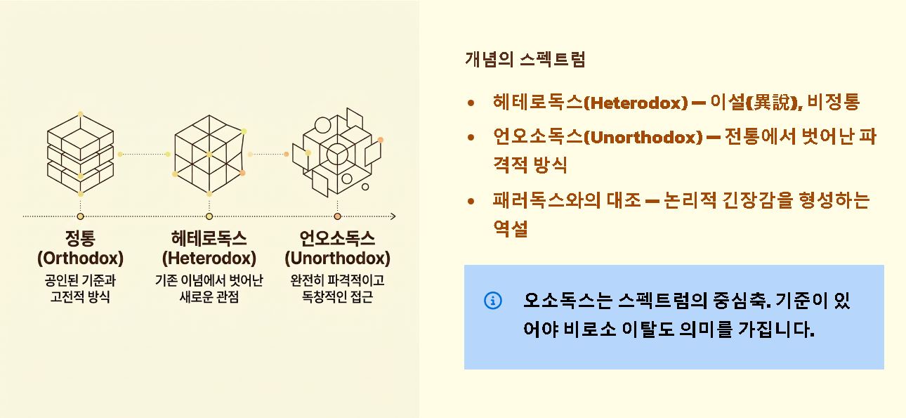 - 모순과의 관계: 상식적이고 정석적인 오소독스는 때때로 패러독스의 뜻과 대조되며 논리적 긴장감을 형성합니다.