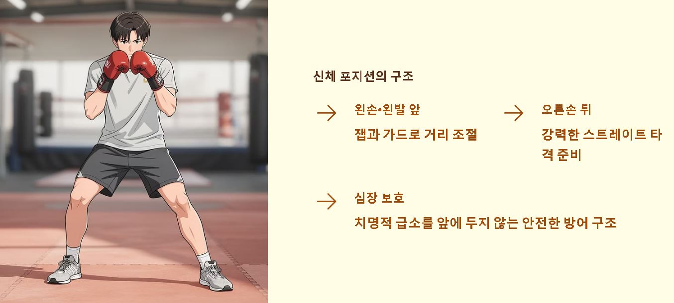 - 신체적 포지션: 왼손과 왼발이 앞에 나가고 오른손을 뒤에 배치하여 강력한 타격을 준비합니다.