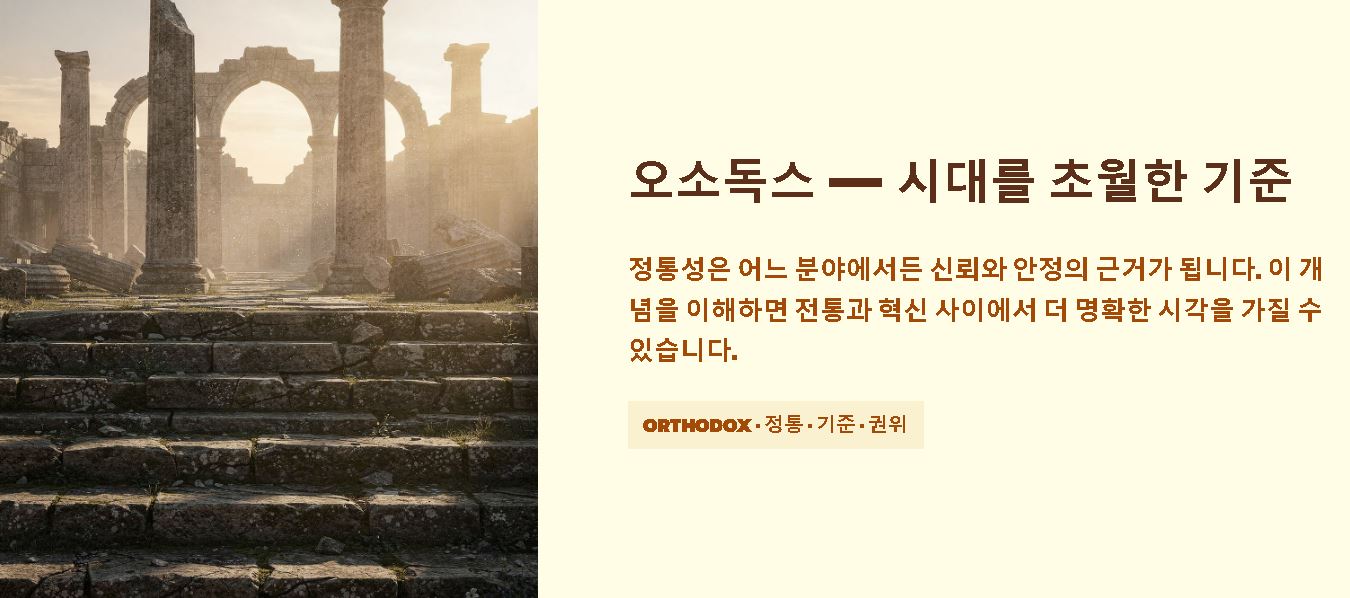 인문학적 관점에서 오소독스의 뜻은 신념의 체계를 유지하는 가장 엄격한 기준이 됩니다. 정통 교회(Orthodox Church)나 정통 경제학처럼 한 집단이 수 세기 동안 지켜온 핵심 가치는 시대를 초월하여 그 권위를 유지하는 정신적 지주 역할을 수행합니다.