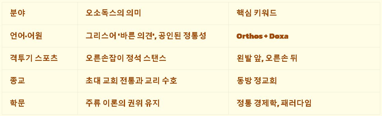 요약: 오소독스는 '바른 의견'이라는 어원을 가진 단어로, 어떤 분야에서 정통적이고 표준적인 방식이나 교리를 의미합니다.