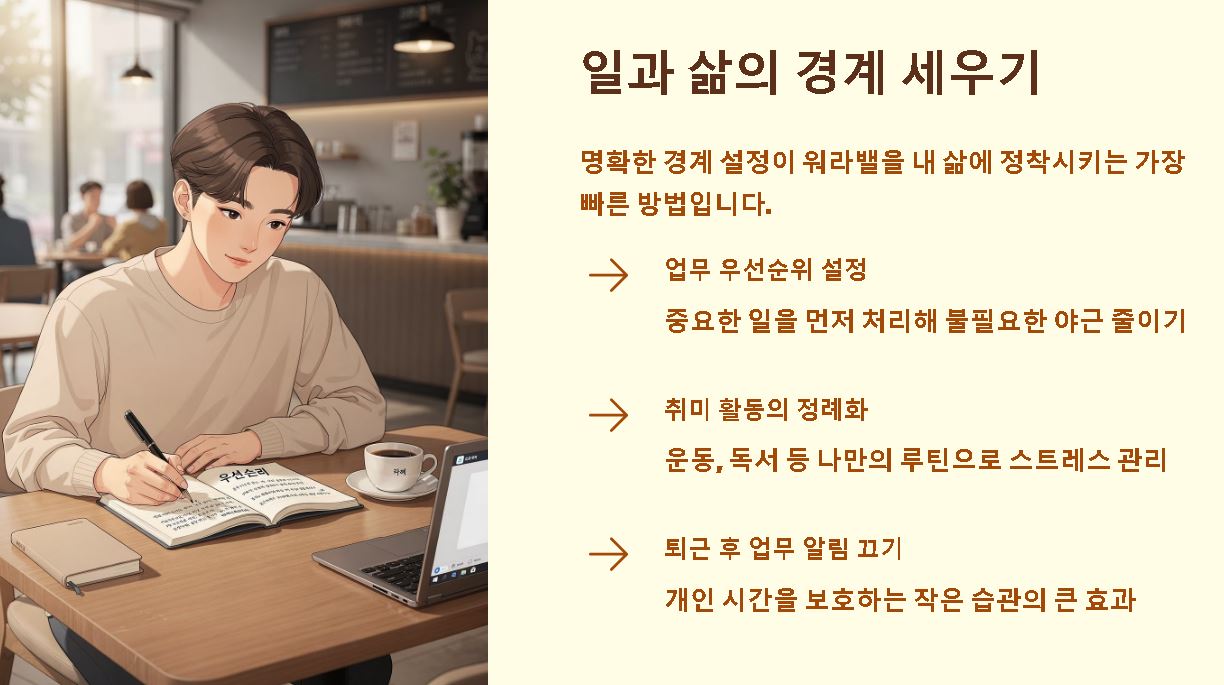 요약: 워라밸은 외부에서 주어지는 환경에만 의존하기보다 개인 스스로가 삶의 우선순위를 정립할 때 완성됩니다.
