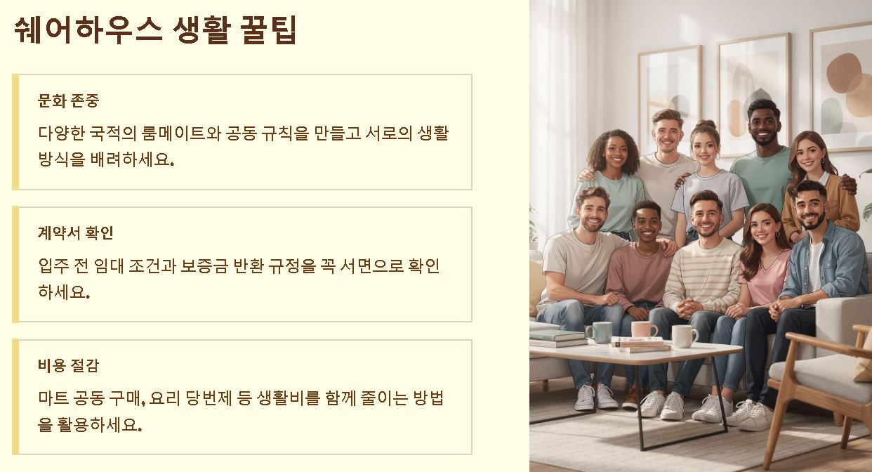 - 쉐어하우스 매너: 다양한 국적의 사람들과 함께 지낼 때는 서로의 문화를 존중하고 규칙을 지키는 태도가 필수적이에요.