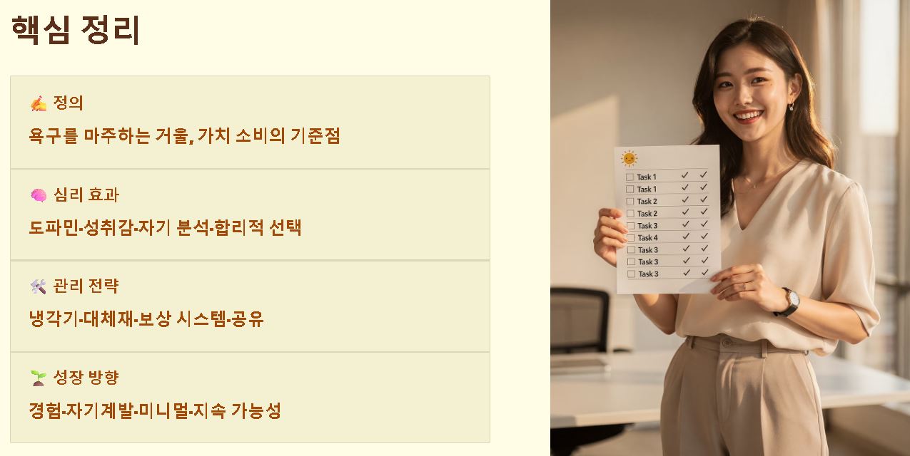 요약: 위시 리스트 작성은 정서적 즐거움을 줄 뿐만 아니라 장기적인 목표 달성을 돕는 심리적 장치입니다.