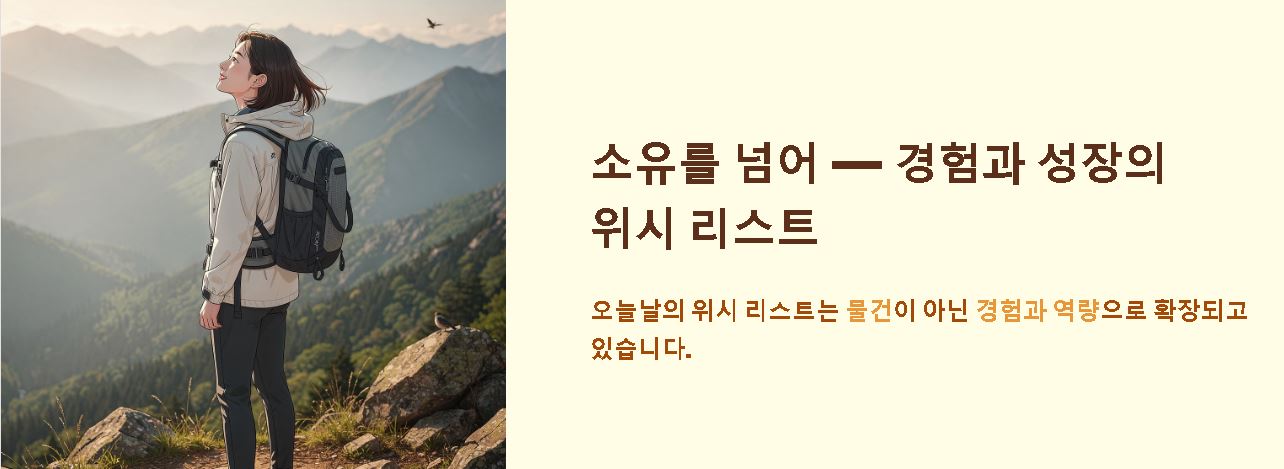 - 경험 중심 리스트: 소유보다 경험을 중시하는 소비 패턴을 반영하여 여행이나 공연을 포함합니다.