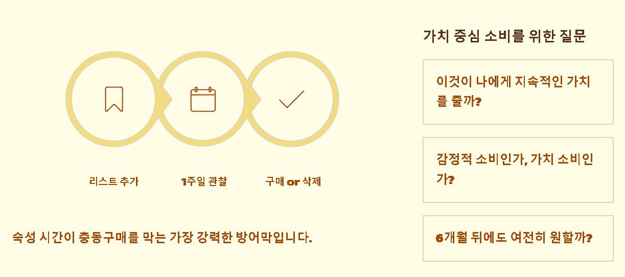 - 냉각기 제도 도입: 리스트에 넣은 후 최소 일주일은 지켜보며 구매 욕구가 지속되는지 확인합니다.