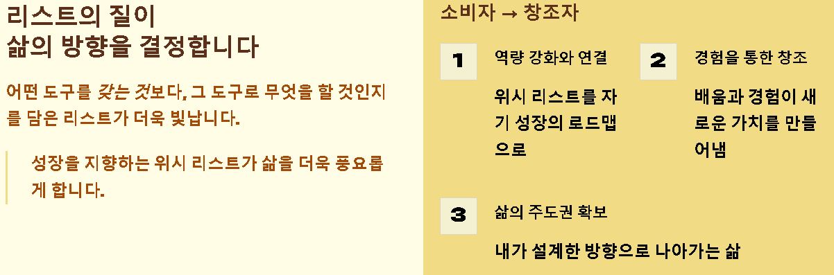 요약: 위시 리스트의 질이 곧 삶의 방향을 결정하며, 성장을 지향하는 리스트가 삶을 더욱 풍요롭게 합니다.