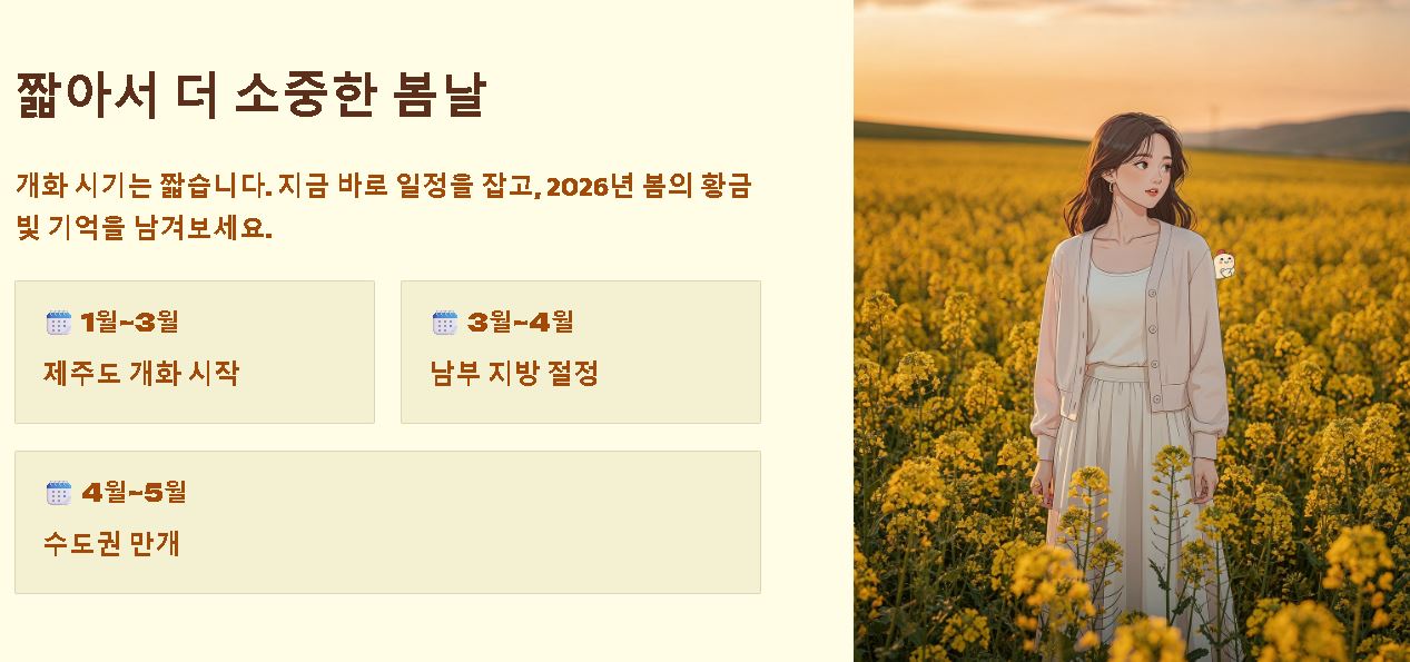 지금까지 온 세상을 황금빛 희망으로 채우는 유채꽃 개화시기와 지역별 핵심 명소, 사진 꿀팁까지 심도 있게 살펴보았습니다. 오늘 여러분의 마음에는 이미 따스한 봄바람과 함께 노란 꽃잎이 일렁이고 있나요? 오늘 정리해 드린 정보가 여러분이 차가운 겨울의 흔적을 씻어내고, 소중한 사람들과 함께 화사한 봄의 에너지를 가득 채우는 '행복한 봄의 주인공'이 되는 데 유익한 가이드가 되었길 바랍니다.