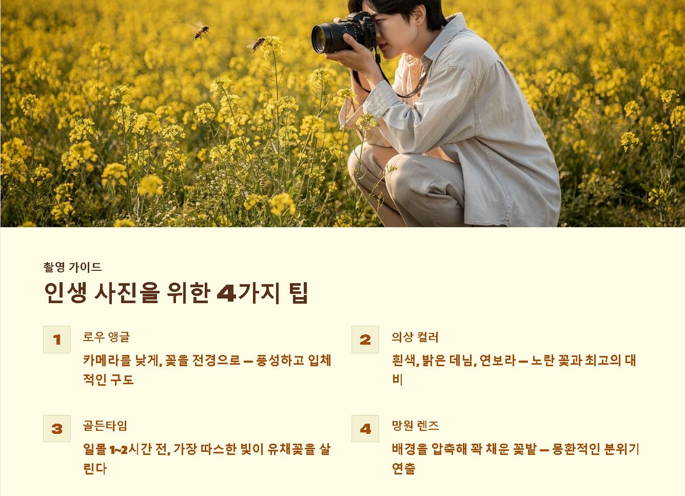 요약: 유채꽃의 채도를 살리는 빛의 시간대와 대비되는 의상 선택이 인생 사진의 성패를 가릅니다.