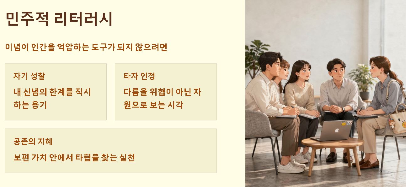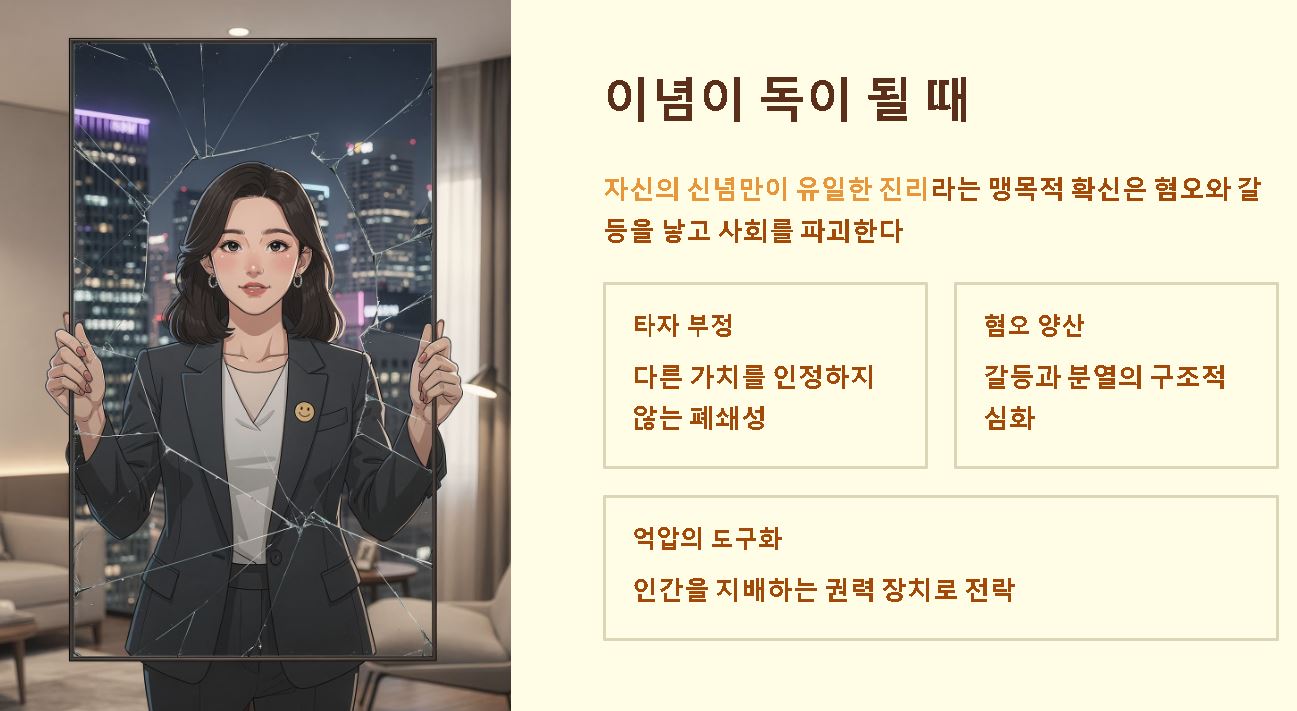 자신의 신념만이 유일한 진리라고 믿는 순간, 이념은 치명적인 독이 되어 사회를 파괴합니다. 타자의 가치를 부정하는 맹목적 확신은 혐오와 갈등을 양산하는데요. 이념이 인간을 억압하는 도구가 되지 않기 위해서는 끊임없는 자기 성찰과 타인의 다름을 인정하는 민주적 리터러시가 반드시 병행되어야 합니다.