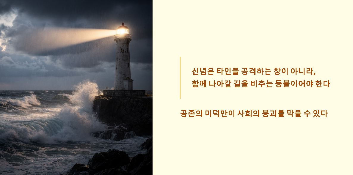 - 공통의 선 추구: 서로의 가치관은 다르더라도 '인간 존엄성'과 '평화'라는 인류 보편의 가치 아래서 타협점을 찾는 지혜가 요구됩니다.