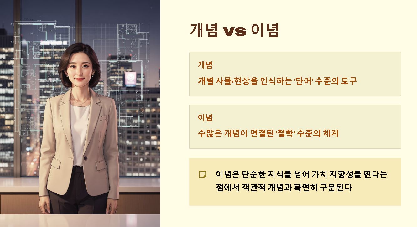 심오한 사상을 이해하기 위해서는 그 사상을 구성하는 최소 단위인 개념 뜻을 먼저 짚어봐야 합니다. 개념이 개별 사물이나 현상을 인식하는 '단어' 수준의 도구라면, 이념은 수많은 개념이 유기적으로 연결되어 완성된 '문장'이나 '철학'이라 볼 수 있는데요. 이념은 단순한 지식을 넘어 가치 지향성을 띤다는 점에서 객관적 사실을 지칭하는 일반적인 개념과 확연히 구분됩니다.