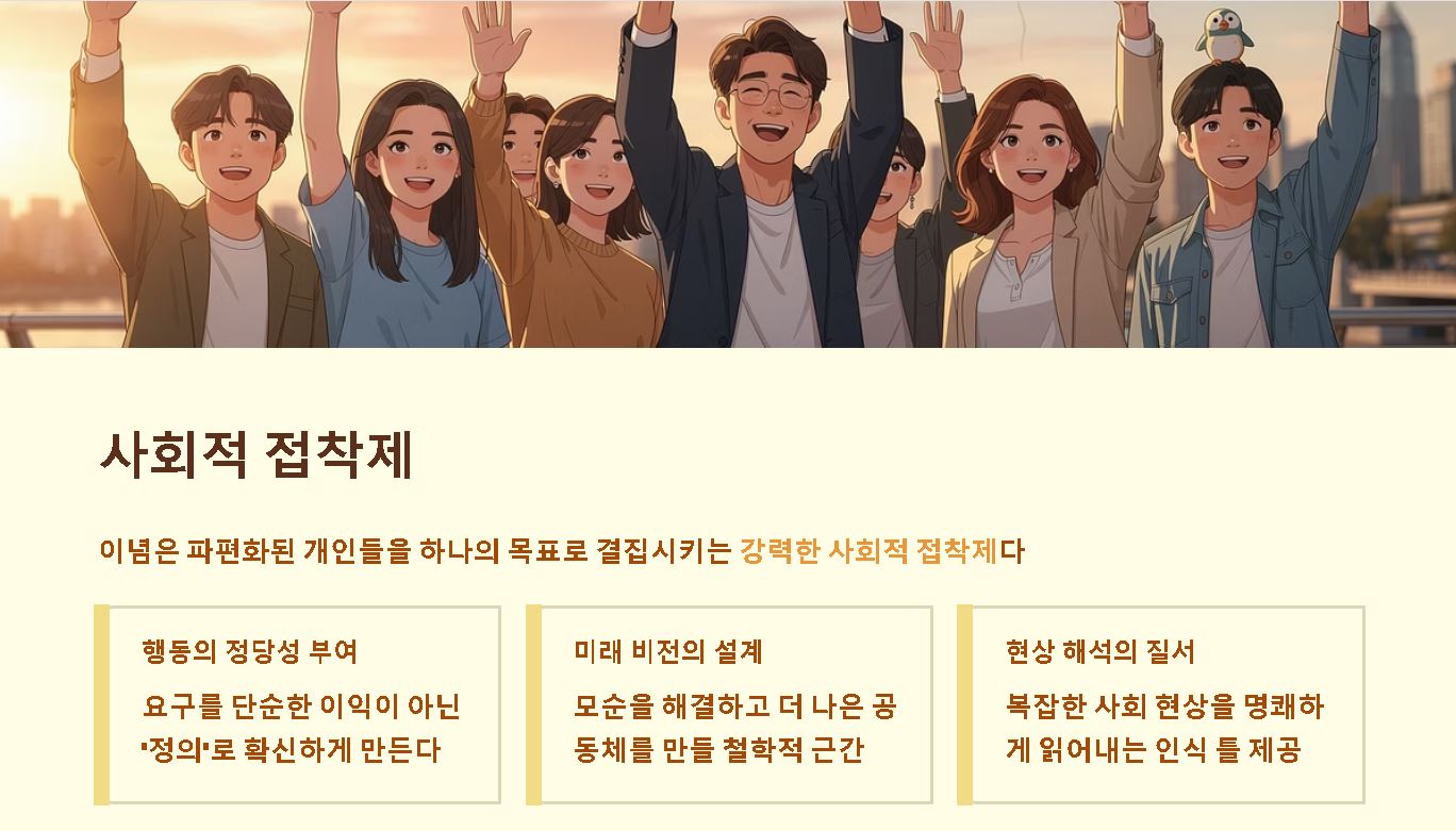 - 행동의 정당성 부여: 특정 이념을 공유하는 집단은 자신들의 요구가 단순한 이익을 넘어 '정의'롭다는 확신을 가지며 강력한 추진력을 얻습니다.