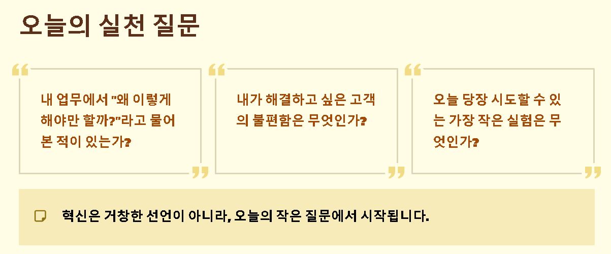 - Q: 실패한 혁신도 가치가 있나요? 그럼요. 실패는 성공으로 가는 과정에서 얻는 가장 비싼 데이터입니다. 실패를 통해 무엇이 작동하지 않는지 알아내는 과정 자체가 다음 혁신의 성공 확률을 높여줍니다.