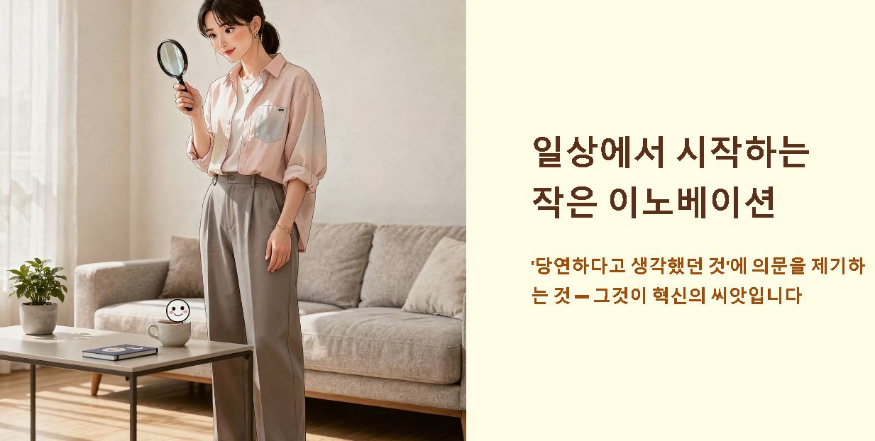 혁신은 거창한 연구소에서만 일어나는 것이 아닙니다. 일상의 불편함을 관찰하고 개선하려는 의지 자체가 훌륭한 혁신의 씨앗이 되는데요. 이노베이션은 '당연하다고 생각했던 것'에 의문을 제기하는 것에서 시작됩니다. 개인의 삶에서도 업무 방식이나 생활 습관을 새롭게 바꾸는 시도는 삶의 질을 획기적으로 높여주는 개인적 혁신이 됩니다.