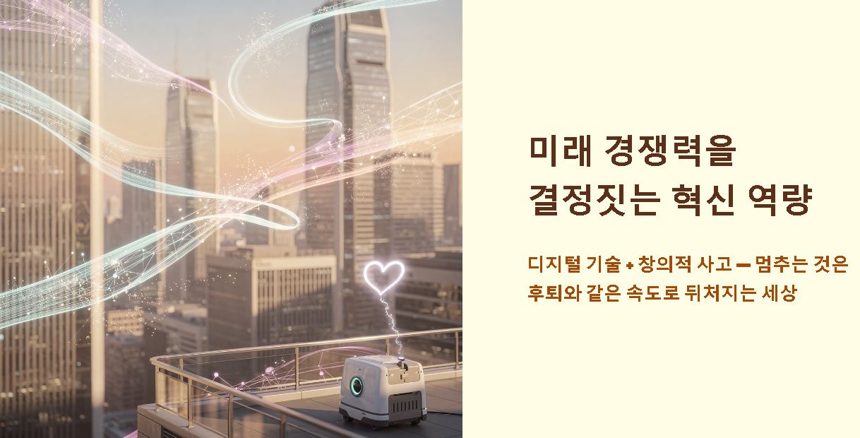 대전환의 시대를 맞아 혁신 역량은 생존을 위한 필수 조건이 되었습니다. 디지털 기술과 창의적 사고를 결합하여 문제를 재정의하는 능력이 핵심인데요. 국가나 기업뿐만 아니라 개인 역시 지속적인 이노베이션을 통해 자신만의 독보적인 가치를 증명해야 합니다. 멈춰있는 것은 후퇴하는 것과 같은 속도로 빠르게 변하는 세상이기 때문입니다.