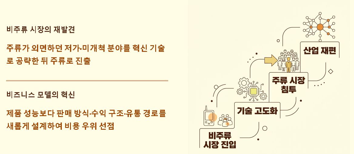 - 비주류 시장의 재발견: 주류 고객이 외면하던 저가 시장이나 미개척 분야를 혁신적 기술로 공략하여 기반을 닦은 뒤 주류 시장으로 진출하는 전략을 취합니다.