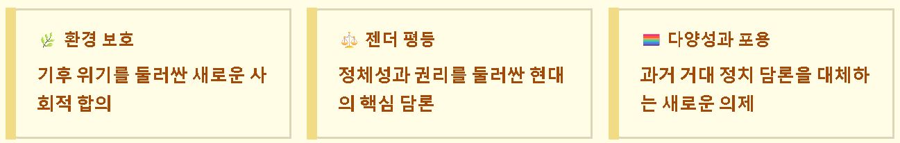 - 미시적 주제로의 이동: 환경 보호나 젠더 평등 같은 주제들이 과거의 거대 정치 담론을 대신하여 새로운 사회적 동의를 얻고 있습니다.