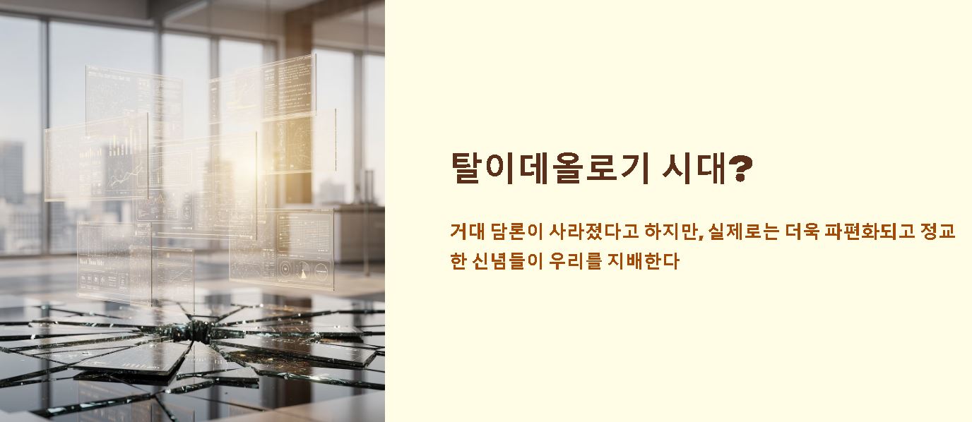 현대 사회는 거대 담론이 사라진 탈이데올로기 시대라고 불리기도 하지만 실제로는 더욱 파편화되고 정교한 형태의 신념들이 우리를 지배하고 있습니다. 거시적인 정치 체계보다 개인의 취향과 정체성이 새로운 관념의 중심이 되고 있습니다.