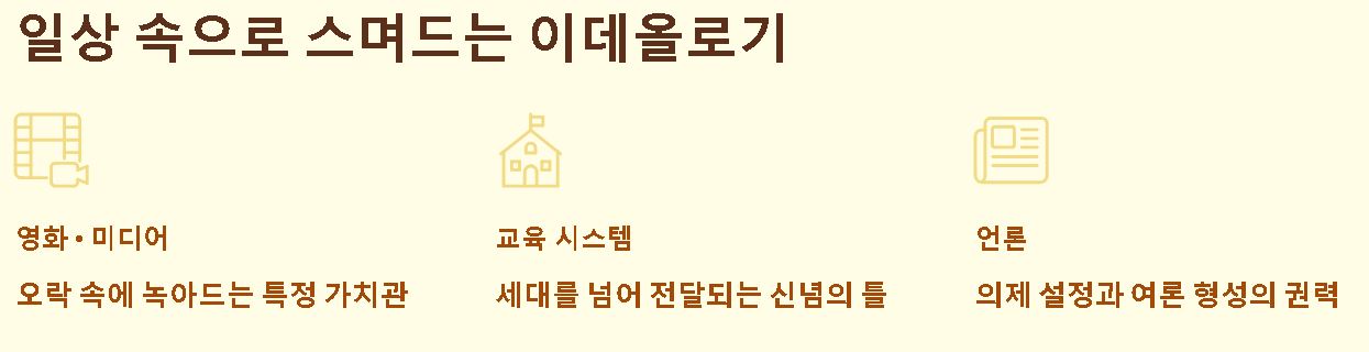 - 일상의 정치화: 영화, 교육, 언론 등 문화적 수단을 통해 대중의 무의식 속에 특정 가치관을 심어주는 과정에서도 강력한 영향력을 발휘합니다.
