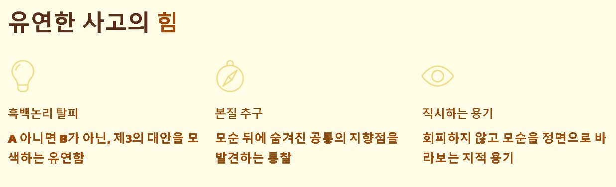 - 본질적 가치 추구: 겉으로 드러난 모순 뒤에 숨겨진 공통의 지향점을 찾아내어 갈등을 해소하려는 자세가 필요합니다.