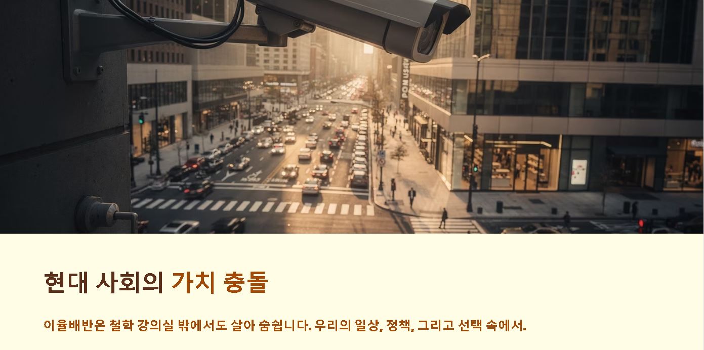 - 자유와 안전의 대립: 개인의 자유를 보장해야 한다는 주장과 공공의 안전을 위해 규제해야 한다는 논리는 대표적인 이율배반적 사례입니다.