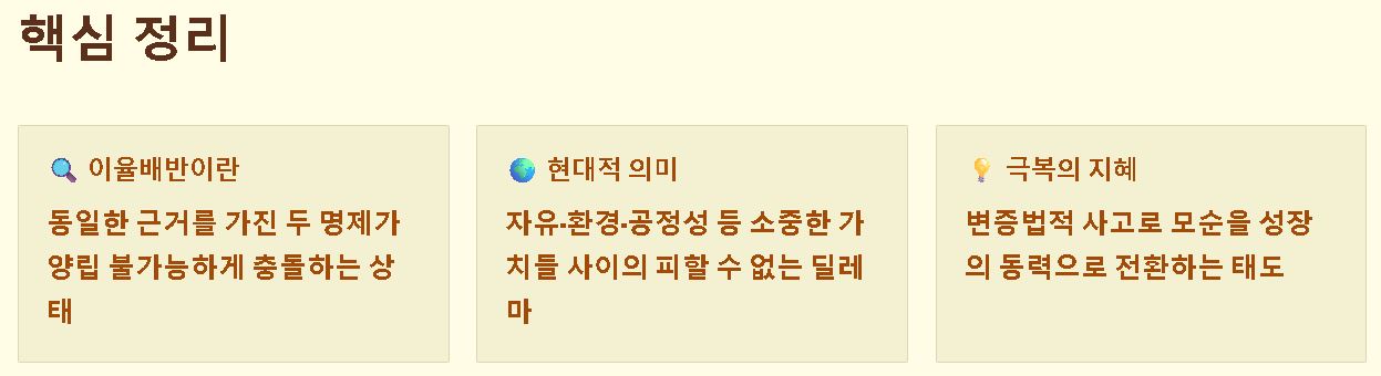 요약: 현대적 의미의 이율배반은 어느 쪽도 포기할 수 없는 소중한 가치들이 충돌할 때 발생하는 고뇌와 선택의 어려움을 포괄합니다.