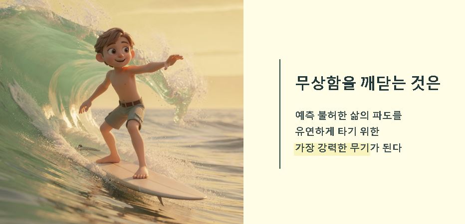 - 삶의 태도 : 무상함을 아는 사람은 결과에 일희일비하지 않고 묵묵히 자신의 길을 걷습니다.