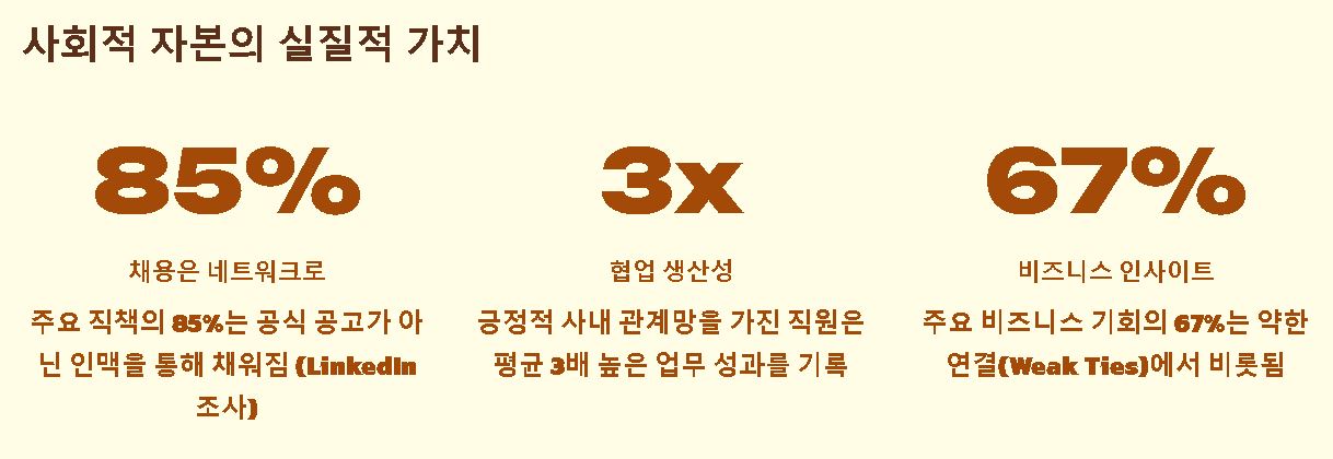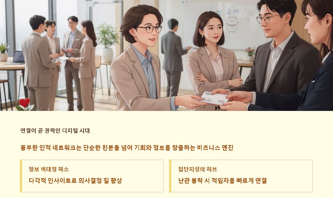- 정보 비대칭의 해소: 다양한 분야의 사람들과 교류하며 얻는 다각적인 정보는 의사결정의 질을 높이고 예상치 못한 비즈니스 인사이트를 제공합니다.
