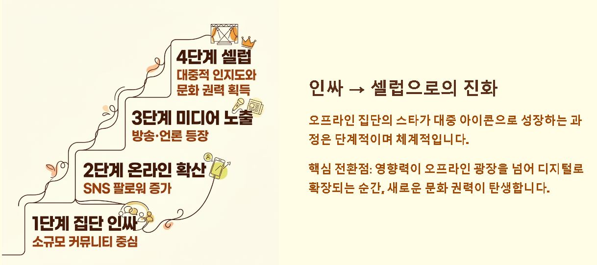 인싸의 영향력이 오프라인 광장을 넘어 대중 미디어로 확장되면 우리는 그들을 '셀러브리티'라 부릅니다. 셀럽 뜻은 대중으로부터 높은 인지도와 인기를 누리는 유명 인사를 지칭하는데요. 집단의 스타가 곧 대중의 아이콘으로 진화하는 과정입니다. 인싸가 주변 사람들에게 인정받는 소규모 집단의 영웅이라면, 셀럽은 검증된 인지도를 바탕으로 사회 전반에 취향과 유행을 전파하는 문화 권력을 상징합니다.