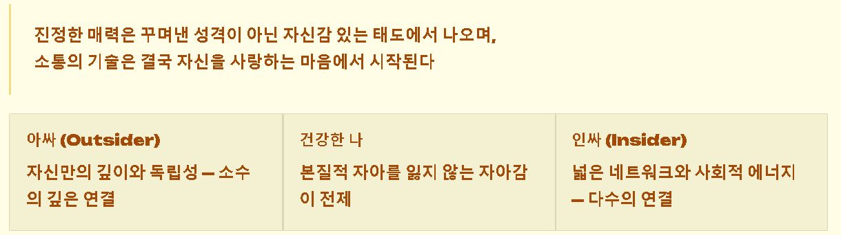 - Q: 내향적인 사람도 인싸가 될 수 있나요? 네, 수동적인 활발함이 아니라 깊이 있는 공감과 전문성을 바탕으로 한 '조용한 인싸'가 되어 조직 내 핵심적인 신뢰를 얻을 수 있습니다.