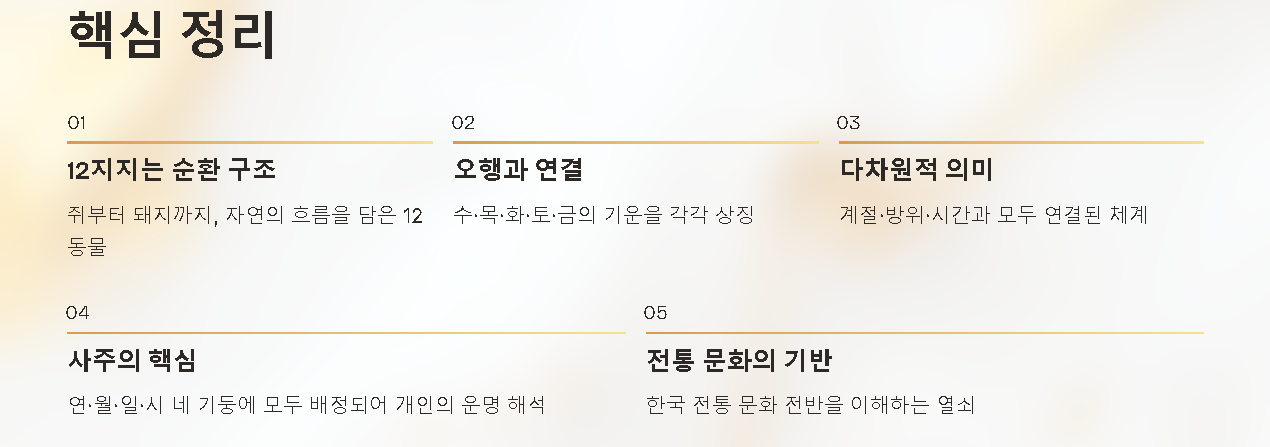 이 구조를 이해하면 사주·명리·풍수뿐 아니라 제사 시간(자시·축시), 절기 순환 등 한국 전통문화 전반을 더 깊이 이해하는 데 도움이 됩니다.