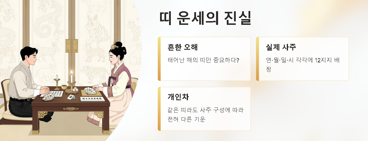 많은 사람들이 태어난 해의 띠만 중요하다고 생각하지만, 실제 사주에서는 연(年)·월(月)·일(日)·시(時) 각각에 12 지지가 들어갑니다. 그래서 같은 띠라도 사주의 구성에 따라 전혀 다른 기운을 가질 수 있습니다.