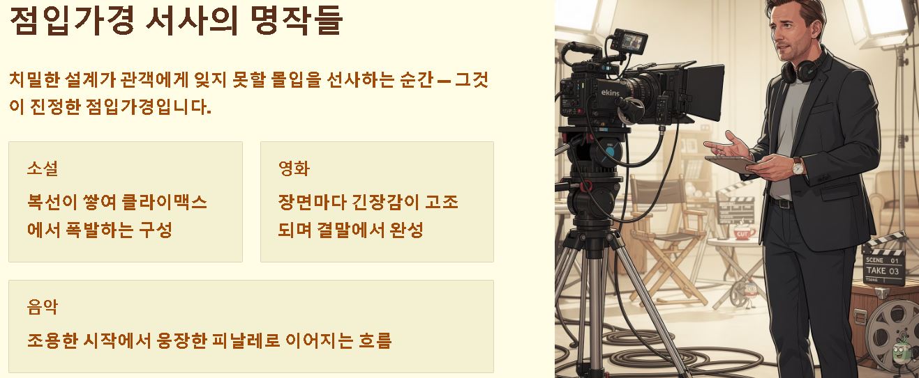 요약: 창작물에서의 점입가경은 치밀한 설계가 만나 관객에게 잊지 못할 깊은 몰입을 선사하는 상태입니다.