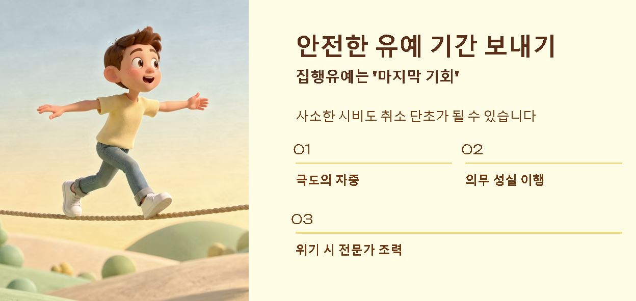 - 분쟁 피하기: 음주 후 시비나 단순 폭행 등 가벼운 사건도 유예 기간에는 치명적일 수 있습니다.