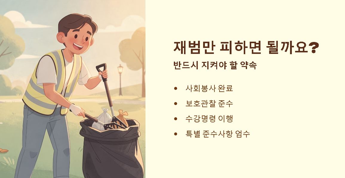 - 특별 준수사항: 도박 금지나 특정인 접근 금지 등 개별적으로 부여된 조건을 엄격히 지켜야 합니다.