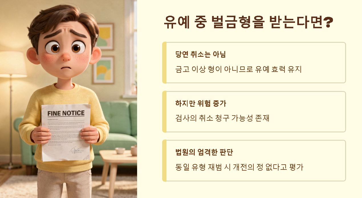 - 당연 취소 제외: 금고 이상의 형이 아닌 벌금형은 원칙적으로 기존 유예 효력을 유지해 줍니다.