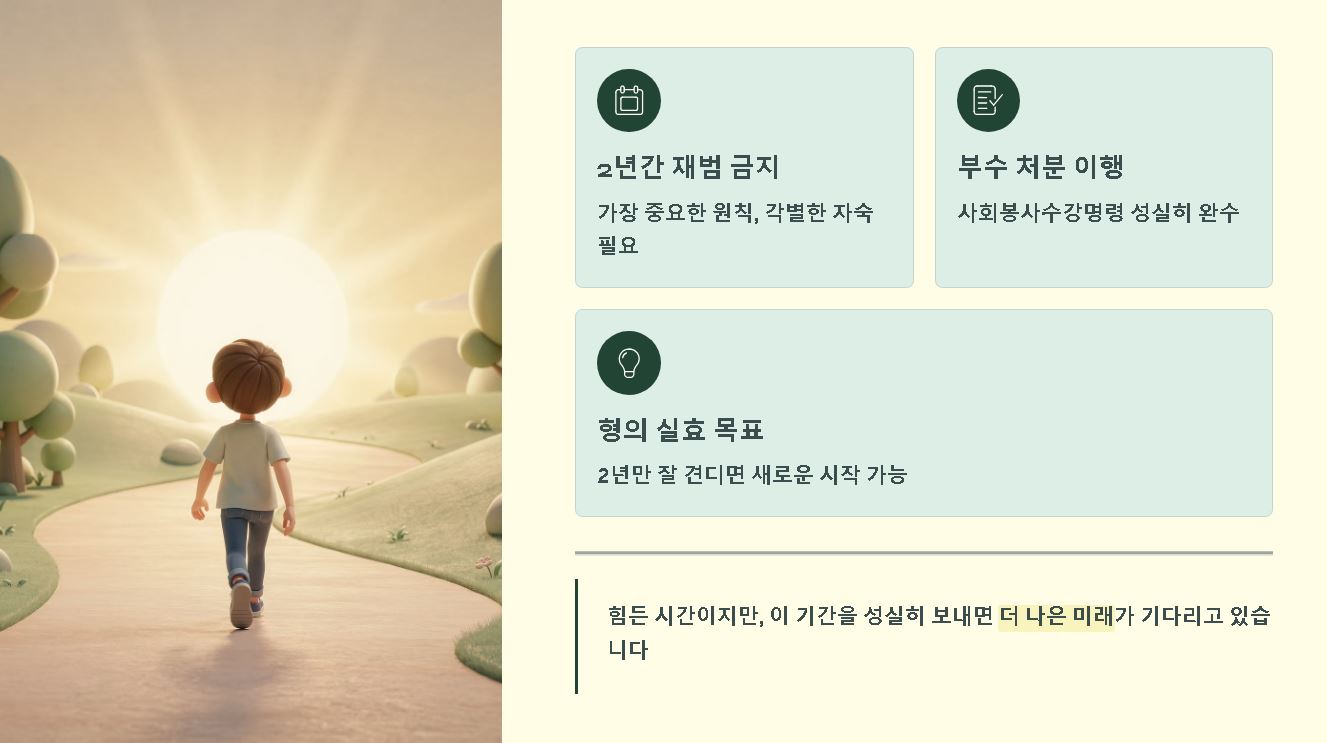 빠른요약: 유예 기간 중 재범은 '합산 처벌'이라는 최악의 결과를 초래하므로 각별한 자숙이 필요합니다.