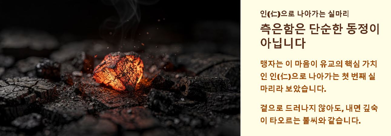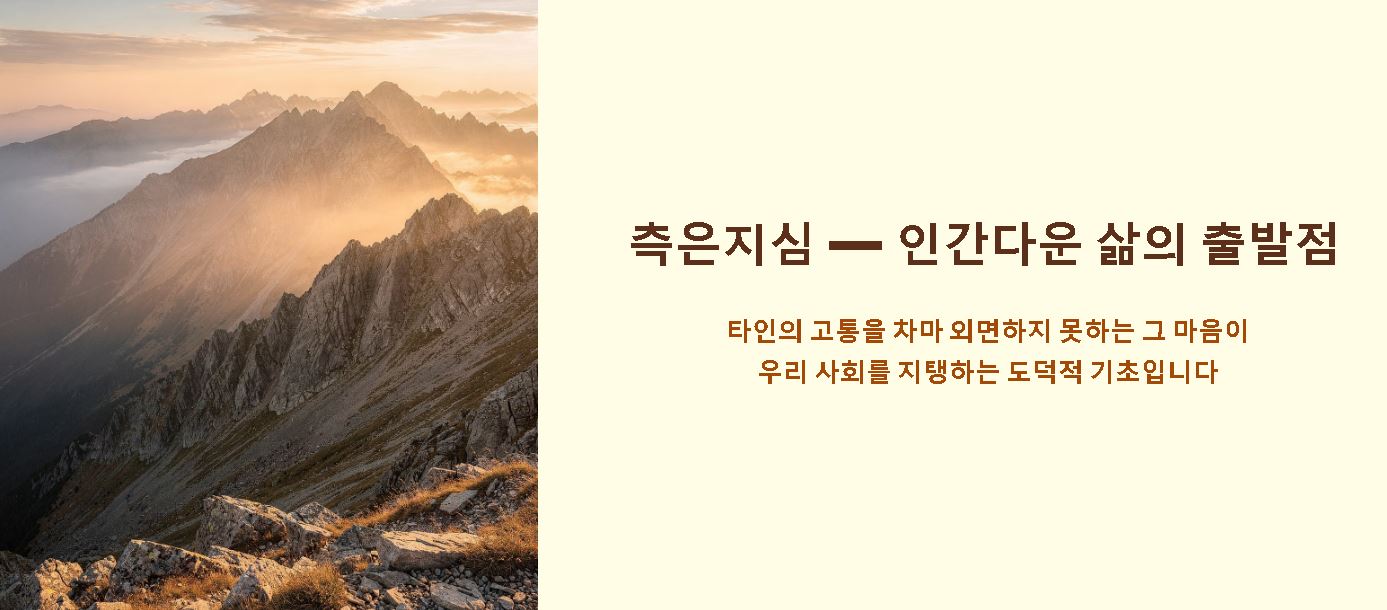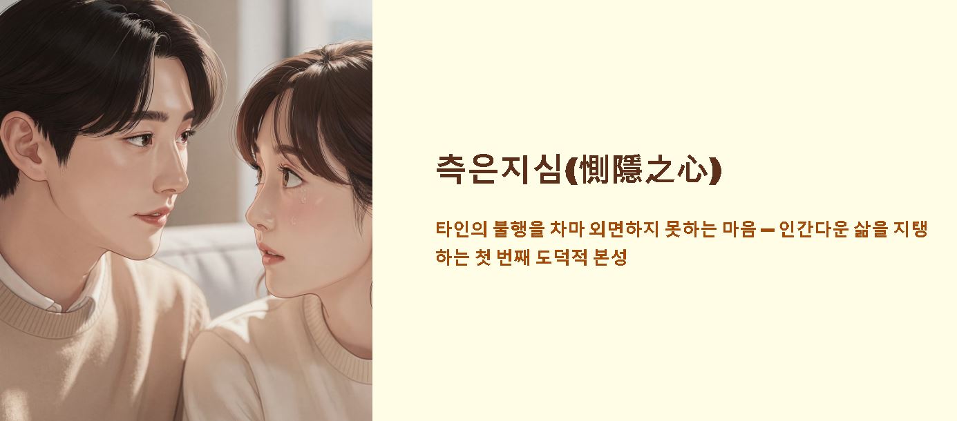 요약: 측은지심은 타인의 고통을 차마 외면하지 못하는 순수한 마음을 뜻하며, 인간다운 삶을 지탱하는 첫 번째 도덕적 성품입니다.